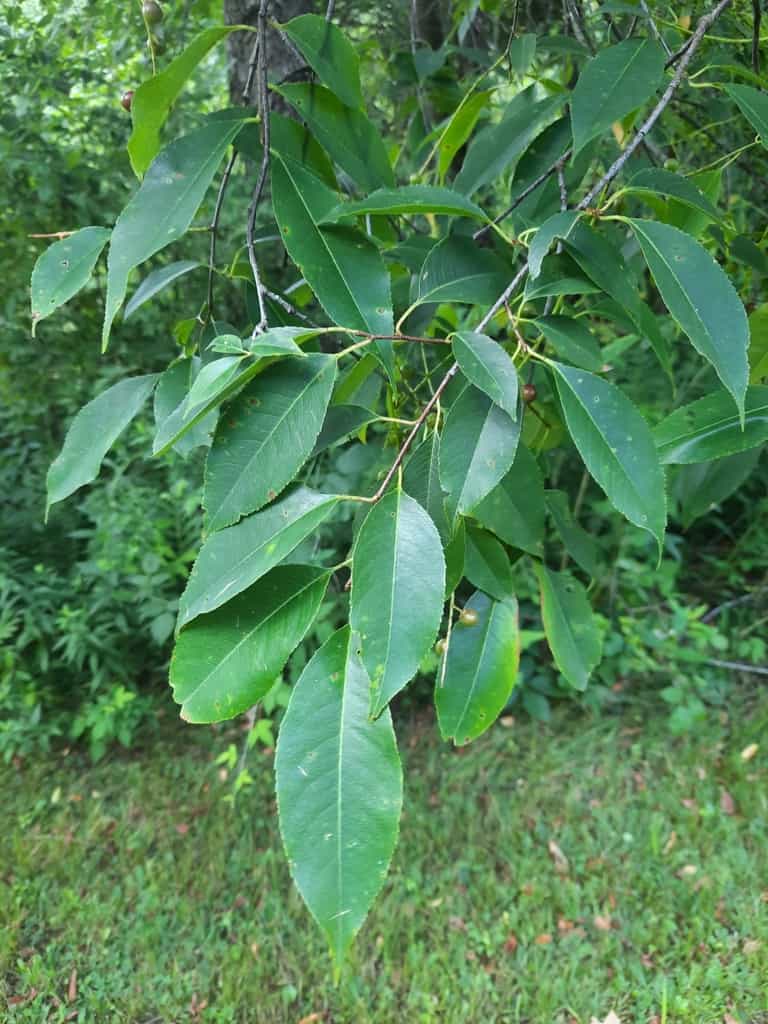 Black Cherry Prunus serotina is a fast-growing, medium size (30’ – 60’ X 15’) deciduous tree that occurs statewide in woodlands, old fields and on fencerows. Lace-like spikes of white flowers are produced in early Spring, and the fruit is available in Spring and Summer. This tree has showy yellow leaves in Fall, which adds lovely color to the landscape.